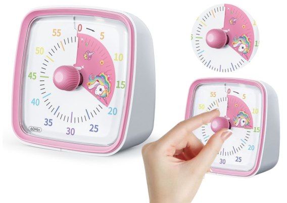 Minutnik posiada pokrętło, które po użyciu zapełnia tarczę wyjątkowym motywem jednorożca co jeszcze bardziej przyciąga uwagę dziecka.
