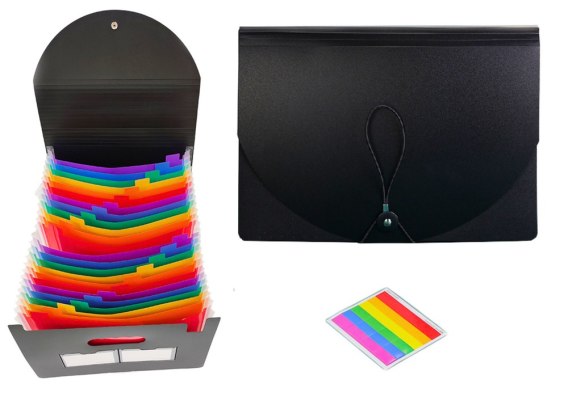 Teczka zawiera aż 24 kieszenie na dokumenty A4, z każdą kieszenią w innym kolorze, co umożliwia łatwe i szybkie sortowanie oraz dostęp do dokumentów.  Każda kieszeń jest wystarczająco przestronna, aby pomieścić nawet kilkaset kartek papieru, co sprawia, że teczka jest idealna do przechowywania dużej ilości dokumentów.  Kieszenie można opisać flamastrem, co ułatwia organizację i odnajdowanie potrzebnych dokumentów. Dzięki temu możesz szybko zidentyfikować zawartość każdej kieszeni.