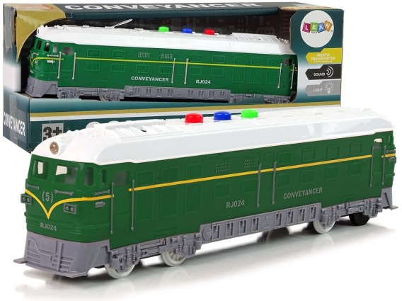 Zabawka posiada efekty świetlne oraz dźwiękowe. Po uruchomieniu przednie światło pociągu świeci się i słyszymy odgłosy pędzącego pociągu. Pozwoli rozwijać wyobraźnię dziecka i wpłynąć na prawidłowy rozwój. Wykonane w kolorystyce zielono- białej. Dzięki zabawie najmłodsi poprawią zdolności manualne oraz koordynację. Wykonany w skali 1:32. Posiada napęd frykcyjny, wystarczy pociągnąć do tyłu i puścić, pociąg będzie jechał przed siebie.
