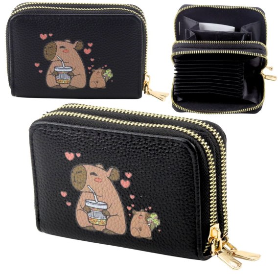 Czarny portfel z uroczym motywem kapibary to funkcjonalny i wygodny dodatek, który łączy kompaktowy rozmiar z dużą pojemnością. Wyposażony w dwie oddzielne komory zamykane na zamki błyskawiczne, zapewnia wygodne przechowywanie kart, banknotów, monet.