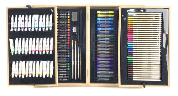 Duży zestaw malarski w drewnianej walizce to kompleksowe rozwiązanie dla dzieci, młodzieży oraz dorosłych, którzy chcą rozwijać swoje zdolności plastyczne i kreatywność. Zestaw składa się aż ze 174 starannie dobranych elementów.