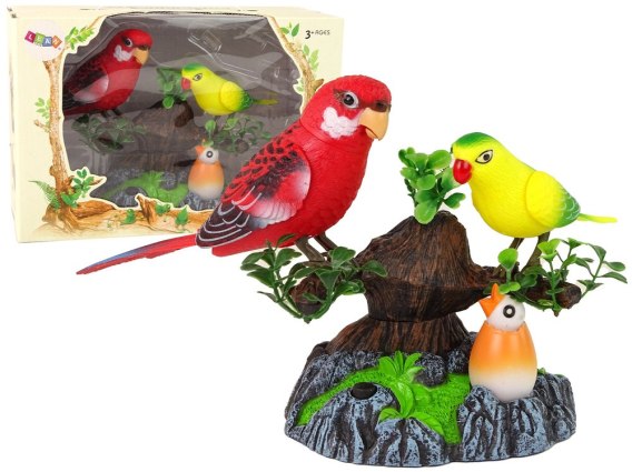 W zestawie możemy znaleźć dwie papugi- czerwoną oraz żółtą, znajdujące się na gałęzi drzewa oraz małą papużkę w skorupce, leżącą pod nim.