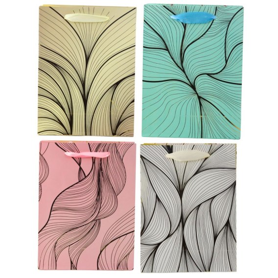 Złote linie na kolorowym tle tworzą efekt delikatnych fal, które dodają całości dynamiki i subtelnej elegancji. Mocne sznurkowe uchwyty w dopasowanym kolorze zapewniają wygodne przenoszenie, a solidna konstrukcja gwarantuje bezpieczeństwo nawet przy cięższych upominkach.