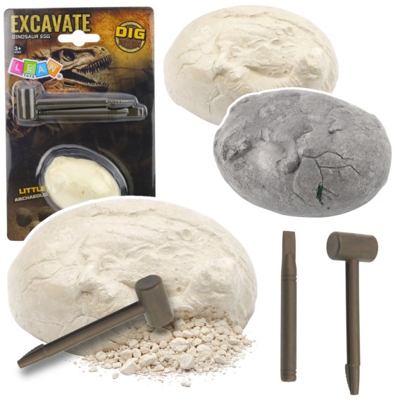 Zabawa polega na stopniowym wydobywaniu dinozaura z gipsowego jajka przy użyciu dołączonych narzędzi. Jajko należy najpierw umieścić w kubku z wodą i poczekać aż opadnie na dno. Następnie po około 5 minutach, gdy masa zmięknie, warto zabezpieczyć miejsce pracy gazetą lub ręcznikiem papierowym i rozpocząć ostrożne usuwanie warstwy gipsu przy pomocy płaskiej krawędzi dłutka. Proces należy kontynuować do momentu całkowitego odsłonięcia figurki, a po zakończeniu wykopalisk opłukać dinozaura w czystej wodzie.