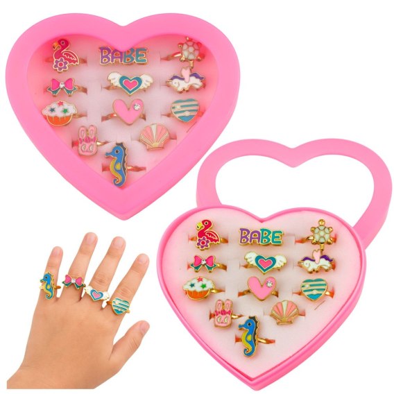 ZESTAW PIERŚCIONKÓW DLA DZIECI 12 SZTUK REGULOWANE W PUDEŁKU SERCE